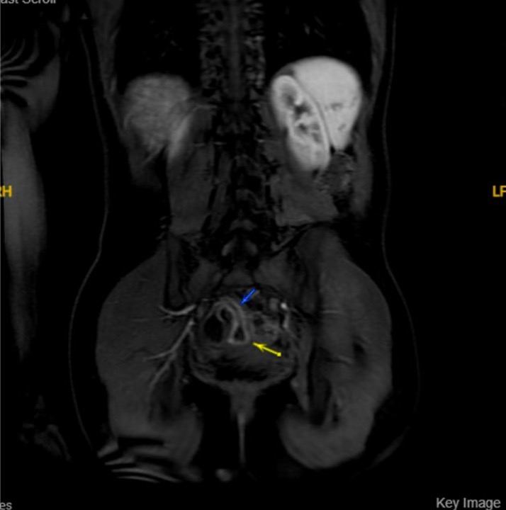 - 8 cm of terminal ileal thickening consistent with a known diagnosis of Crohn’s disease. No abscess. No stricture noted.