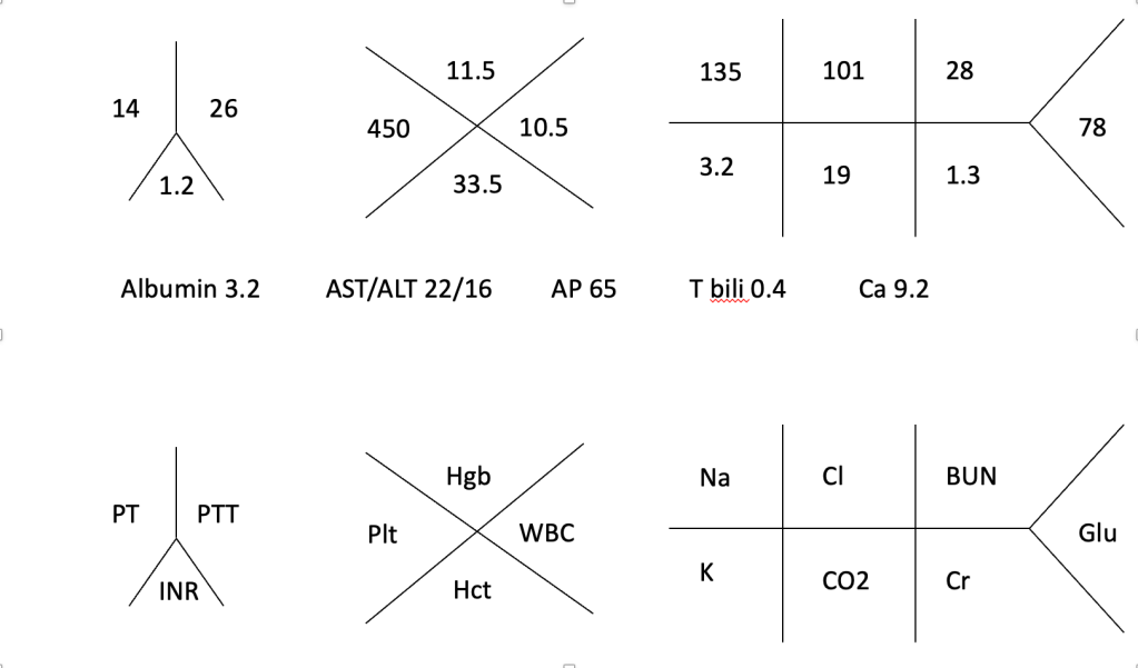 Her labs are shown below. CT enterography shows no small bowel enhancement or thickening