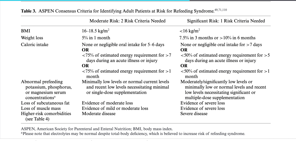 ASPEN criteria for identifying those at risk for Refeeding syndrome